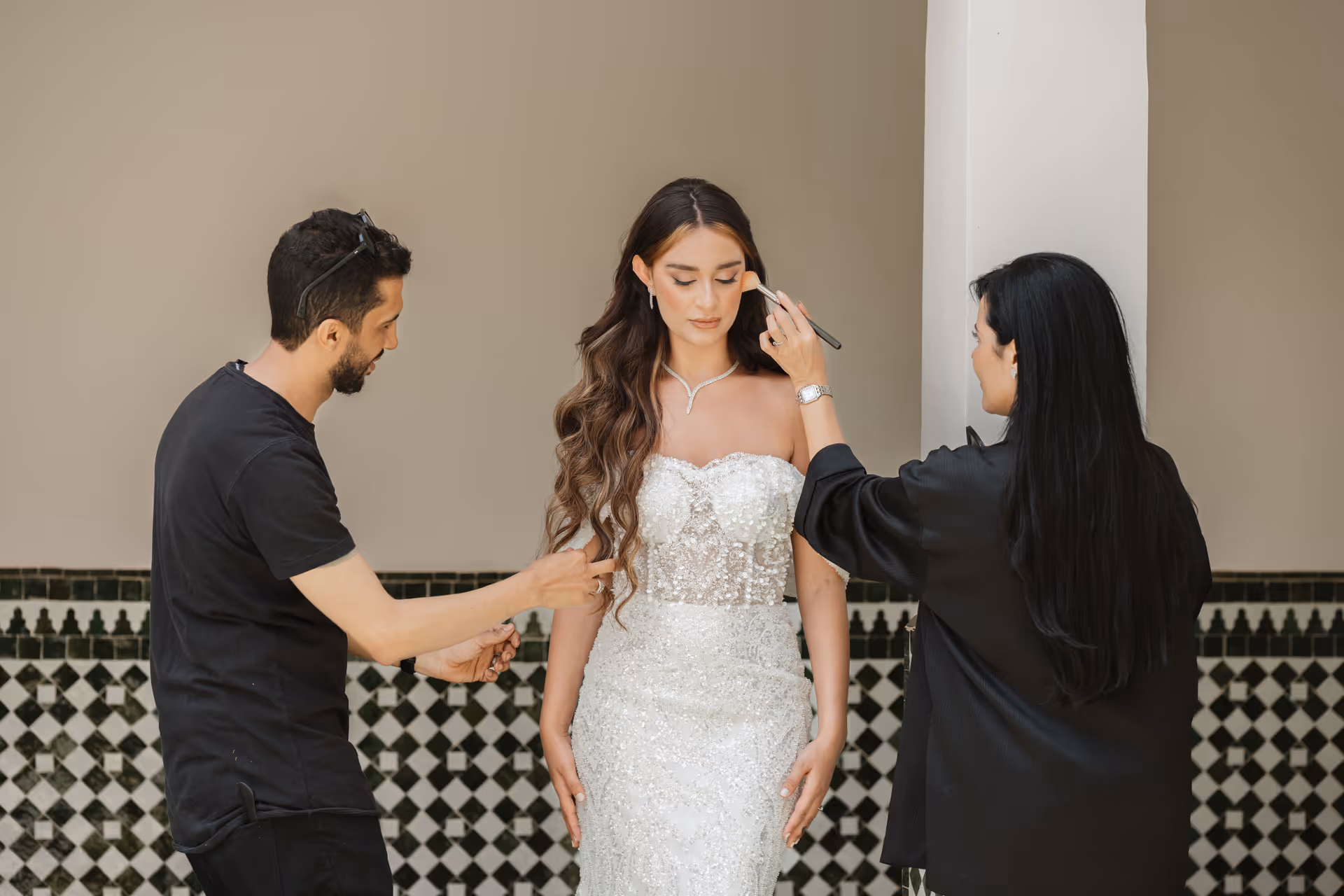 Nous proposons une séance d'essai beauté essentielle pour imaginer ensemble votre look parfait. Le jour J, nous nous déplacons sur le lieu de votre choix (hôtel, villa, riad, domaine), au Maroc ou à l'international. Un service d'accompagnement journée est également disponible pour assurer des retouches et veiller à votre éclat tout au long de l'événement. Chaque détail est pensé pour que vous soyez sereine, sublime et rayonnante du premier regard au dernier sourire.